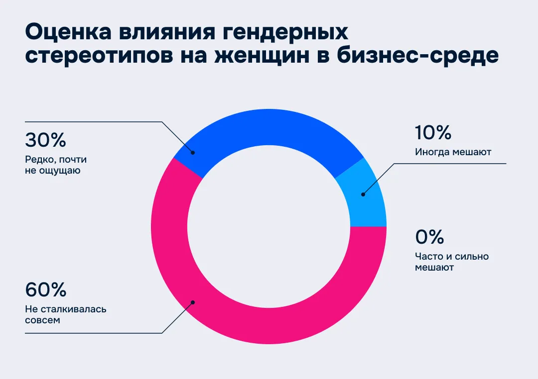 В Казахстане женский бизнес воспринимается как норма. Исследование показывает, что 60% предпринимательниц вообще никогда не сталкивались с гендерными стереотипами в деловой среде. Еще 30% ощущает их редко — настолько, что это почти не влияет на работу. А тех, кому предрассудки мешают часто и сильно, среди опрошенных просто нет.