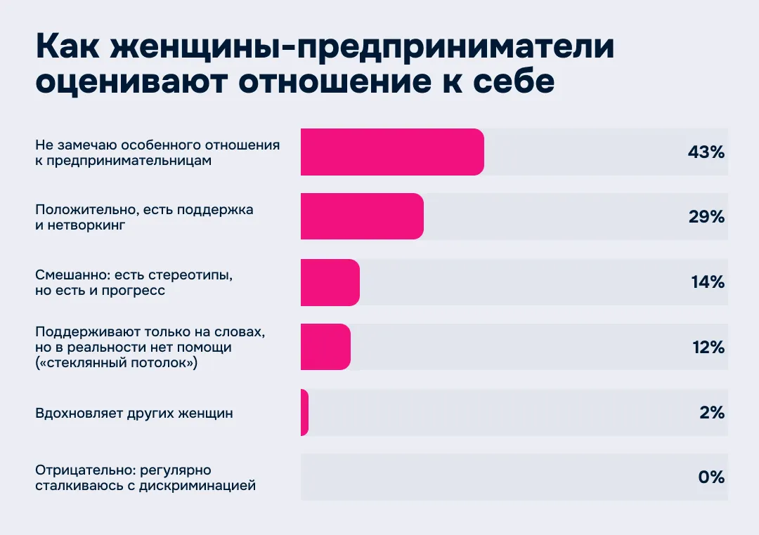 Окружение тоже не давит. Почти половина респонденток (43%) не видят никакого особенного отношения к женщинам-предпринимателям, еще треть (29%) чувствуют реальную поддержку и успешно заводят полезные знакомства.