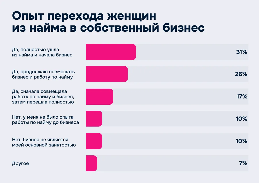Как выяснилось, женский бизнес в Казахстане редко бывает спонтанным прыжком в неизвестность. Только треть опрошенных (31%) уволились с работы и сразу ушли в свободное плавание. Остальные выбирают более безопасную стратегию. 26% до сих пор совмещают бизнес с работой по найму. 17% сначала совмещали и только потом, убедившись в успехе, полностью переключились на бизнес. И почти каждая десятая (9,5%) вообще рассматривает бизнес как подработку, не делая его основной занятостью.