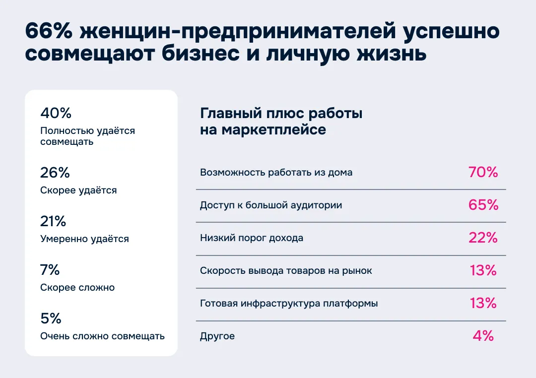 Кроме того, бизнес на маркетплейсе часто становится ответом на жизненные вызовы: для трети респонденток (36%) решение начать свое дело было продиктовано обстоятельствами, а 31% привлекла гибкость — возможность проводить больше времени с семьей, не отказываясь от карьеры.